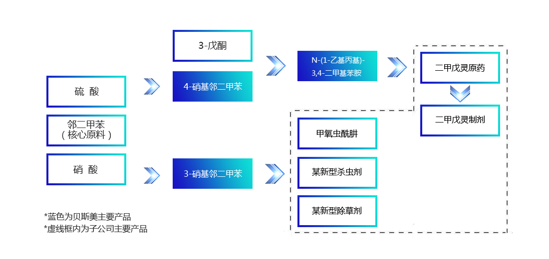 主要產(chǎn)品有4-硝基鄰⼆甲苯、N-(1-⼄基丙基)-3,4-⼆甲基苯胺等。